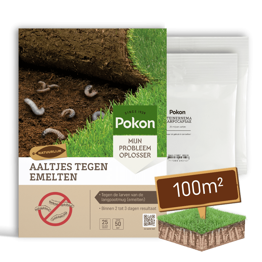 Wat zijn emelten? De larven van de langpootmug worden emelten genoemd. Ze kunnen jouw gazon flink beschadigen doordat ze zich voeden met de wortels van het gras. Emelten zijn overdag vaak niet zichtbaar, maar 's nachts kruipen ze naar boven om gras te eten. Hierdoor ontstaan kale, bruine plekken in je gazon. Emelten bestrijden doe je eenvoudig en effectief met aaltjes. Aaltjes tegen emelten verspreid je met gieters over je gazon. Regelmatig sproeien houdt de grond vochtig, zodat de aaltjes hun werk kunnen doen. Na ongeveer 3 weken zie je resultaat: de larven zijn dood en het gras kan zich herstellen.