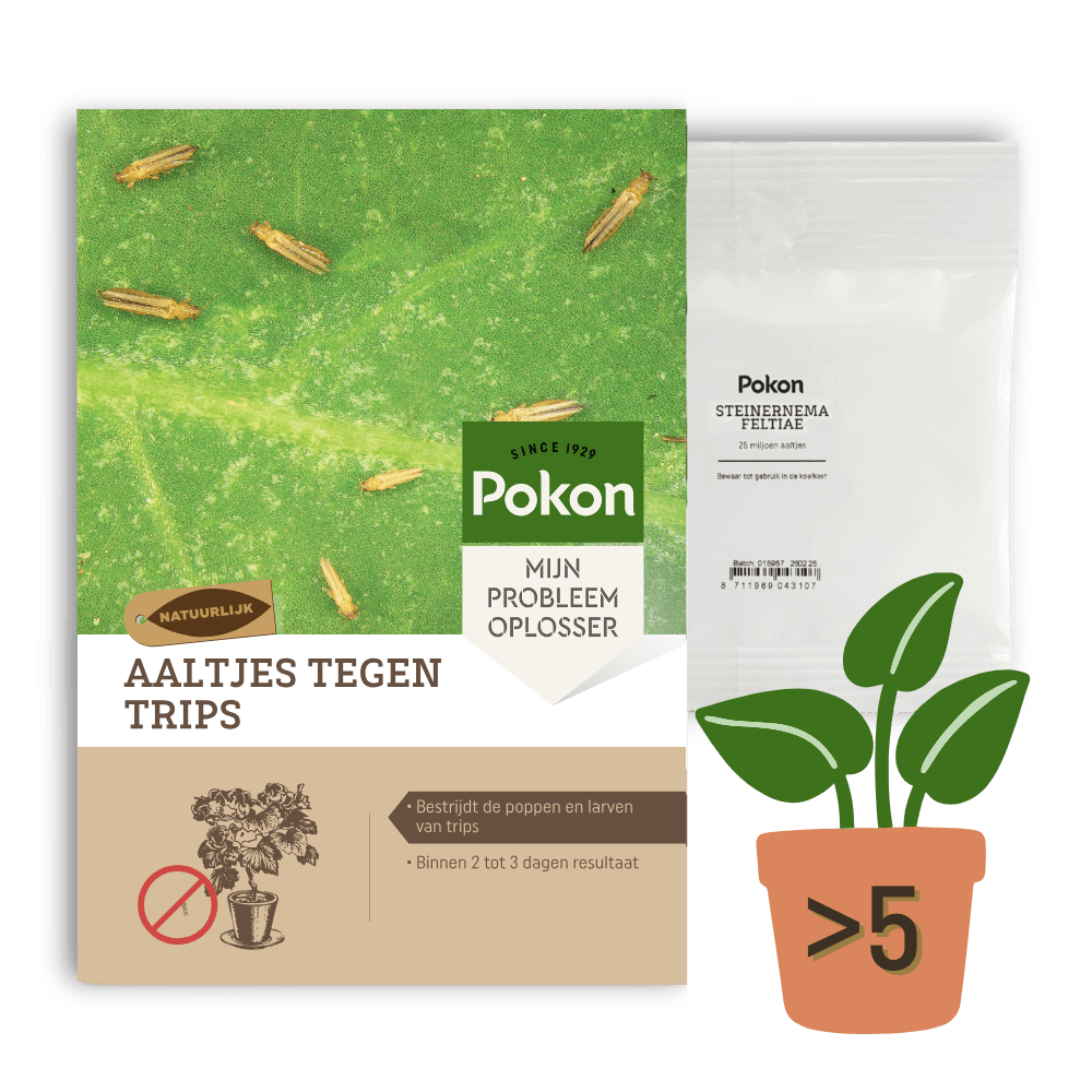 Trips zijn kleine insecten die schade kunnen aanrichten aan je planten. Ze zijn meestal minder dan 1 mm lang en hebben een smal, langwerpig lichaam. Trips zuigen de cellen van planten leeg, wat kan leiden tot misvormde groei, vlekken op bladeren en bloemen, of zelfs de dood van de plant. Ze kunnen ook virussen overbrengen tussen planten. Het bestrijden van trips is lastig vanwege hun kleine formaat en snelle voortplanting. Met aaltjes tegen trips kun je de larven effectief en natuurlijk bestrijden. De aaltjes dringen de larven binnen en scheiden een bacterie af. De tripslarve sterft, en de aaltjes vermenigvuldigen zich. De nieuwe aaltjes gaan op zoek naar meer tripslarven, totdat de plaag is opgeruimd.