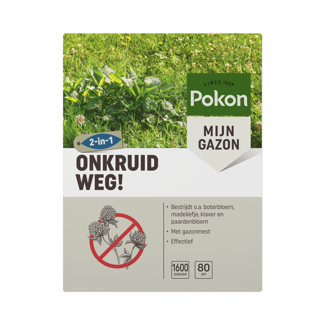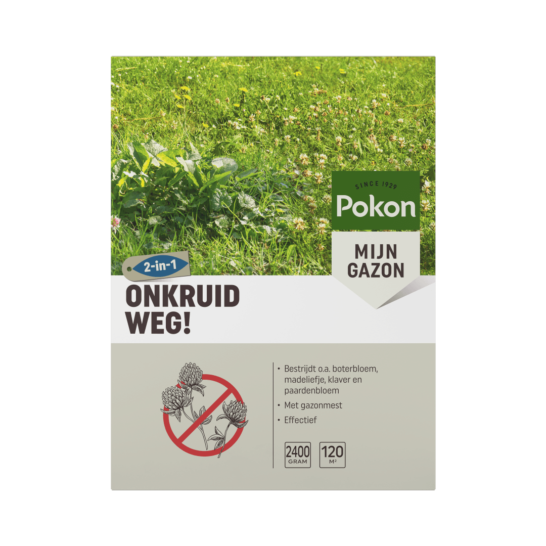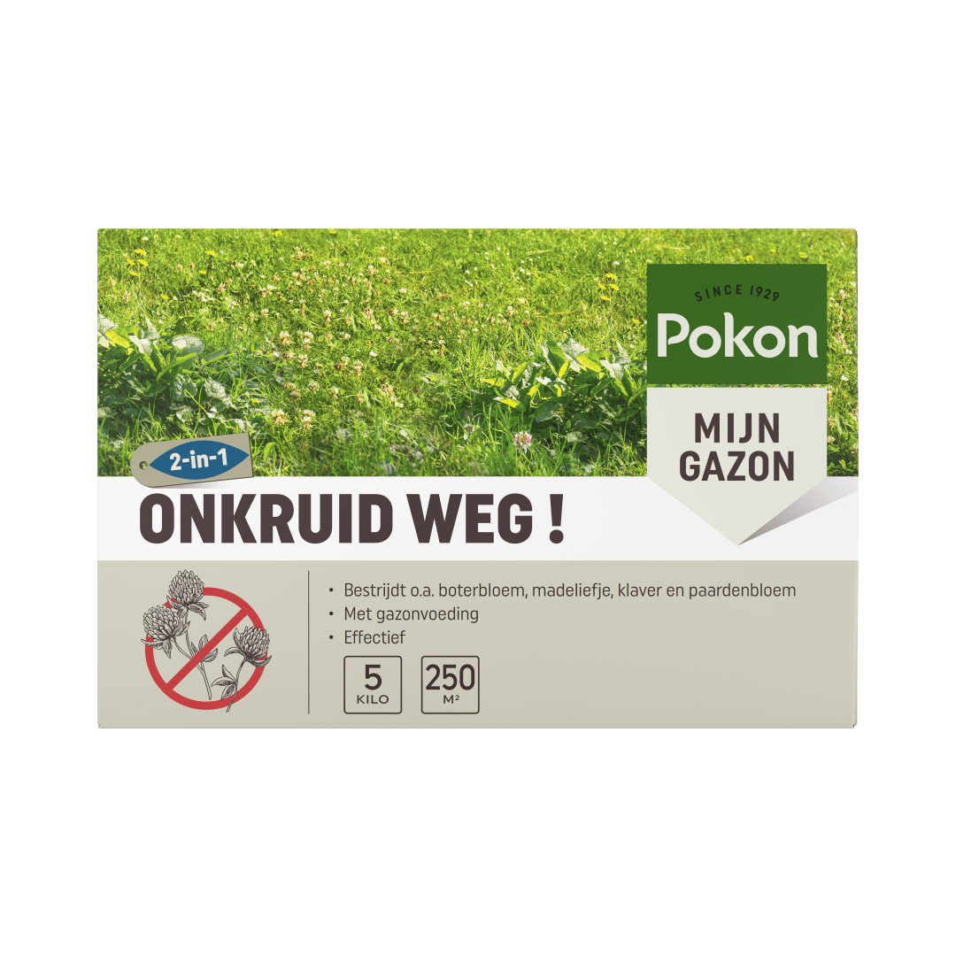 Onkruid in je gazon kan een doorn in het oog zijn. Het is belangrijk om niet te lang te wachten om het onkruid uit je gazon te verwijderen, want voor je het weet heb je meer onkruid dan gras in je gazon staan. Bestrijd onkruid uit je gazon met Pokon Onkruid Weg! Dit product bevat een onkruid bestrijdingsmiddel en een gazonmest in één. Dit zorgt ervoor dat het onkruid heel hard gaat groeien waardoor het uiteindelijk kapot groeit, en is daarmee niet schadelijk voor je gras. Onkruid Weg is effectief tegen o.a. boterbloem, madeliefjes, klaver en paardenbloem.