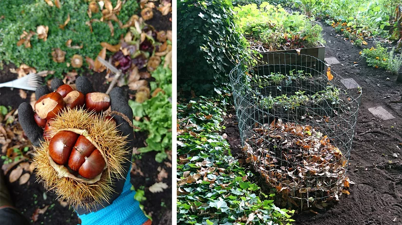 Ik ruim de (uit de bomen gevallen) bladeren iedere week op. Ik gooi dit blad niet weg, maar verzamel het op één plek. Deze doe ik in een hele grote ovalen korf, waarin alle beestjes kunnen overwinteren. Je kunt het blad ook bewaren voor bladcompost, maar zorg dan wel dat er niks anders tussenzit dan blad. Er mogen dan dus geen bolsters van tamme kastanjes bij zitten, zoals bij mij het geval is. Het is heel veel werk om al deze bolsters tussen de bladmassa uit te vissen, dus dat ga ik niet doen. Laat jij alles liggen? Dit is natuurlijk ook een optie en ik moet zeggen dat ik dit het eerste jaar ook heb gedaan. Ik merkte alleen wel dat er veel groen ontstond in mijn tuin dat ik er niet wilde hebben. Doordat ik de bladeren verplaats naar een andere plek waar ook de beestjes lekker hun plekje kunnen vinden, ben ik blij en zijn de beestjes blij :).