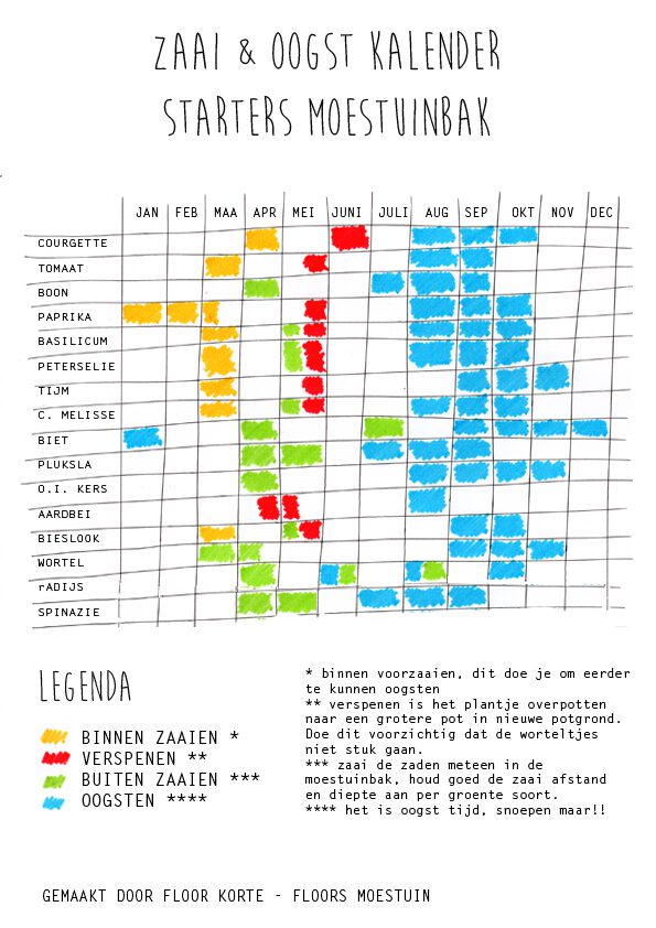 Een zaai- en oogstkalender vind ik altijd heel erg handig, deze pak je er even bij als je niet meer weet wanneer je nou wat moet zaaien, maar geeft je ook een hele overzichtelijke planning. Ik hou van plannen, alles loopt gewoon een stuk soepeler en je vergeet ook geen dingen te zaaien waar je achteraf spijt van krijgt, omdat het dan te laat is. Hieronder zie je een foto van de kalender voor onze moestuinbak. Zoals je ziet starten we deze maand met het binnen voorzaaien van tomaat, paprika, basilicum, peterselie, tijm, citroenmelisse en bieslook. Wortel kun je al direct in de moestuinbak zaaien, in speciale Pokon Mix voor je Moestuinbak.