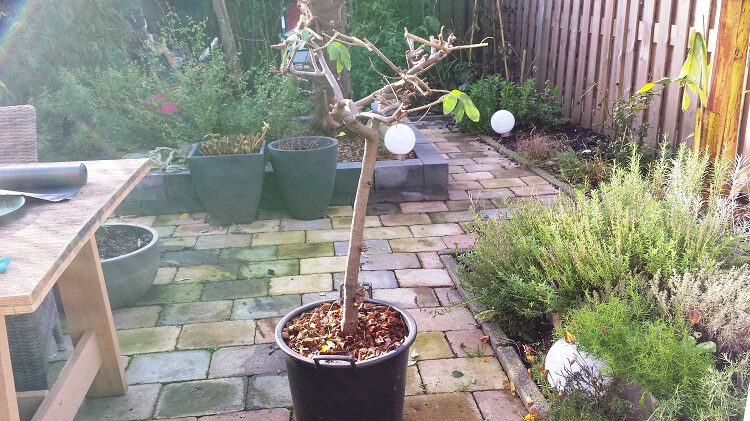Flink teruggesnoeid, maar ik weet uit ervaring dat ze dat kan verdragen. En het is niet anders, ze staat op stam en is zo zonder takken en blad al ruim 150 centimeter hoog, ik zou haar gewoon niet op zolder krijgen met die grote hoeveelheid takken en bladeren. En er moet nog meer planten in potten een paar maanden op zolder bivakkeren……