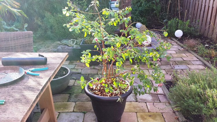 Een Fuchsia (zonder naam maar zo prachtig mooi koraalrood met zalmoranje van kleur en zo rijkbloeiend dat niet kopen afgelopen voorjaar geen optie was. En dus mag ze ook naar zolder. Want een Fuchsia kan wel iets meer kou verdragen dan een Cassia maar de meesten verdragen geen matige vorst, en de combinatie van vorst met de kletsnatte grond waarin ze staat (met dank aan alle regen van vorige week) kan wel funest worden. Ook Fuchsia’s snoei ik eigenlijk het liefst niet, maar om makkelijker te verplaatsen, ruimte te besparen plus geen onnodige ziekten/schimmels in de overwinteraars op zolder te krijgen, knip ik de takken wel wat terug.