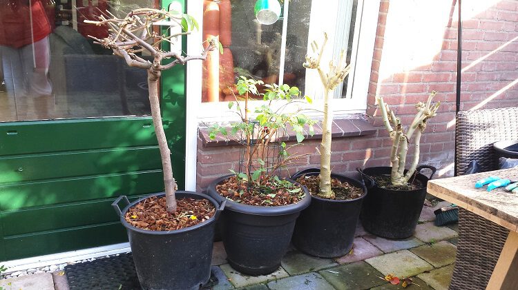 Van links naar rechts de Cassia, Fuchsia, en daarnaast 2 Brugmansia’s (die flink terugsnoeien zoals je ziet dus ook heel goed kunnen verdragen). Zo staan de planten nog even iets op te drogen voor ze voor de vorst naar zolder gesjouwd gaan worden. En daar zullen ze tot april blijven, zonder voeding, met amper vocht. In maart/april gaan we de planten goed bekijken, ze lichter en warmer zetten,voeding en meer vocht geven, ze in vorm snoeien, en dan kijken of en hoe ze gaan uitlopen en weer aan de groei komen. Als de kans op vorst dan voorbij is mogen ze weer naar buiten, voor een nieuw tuinjaar.