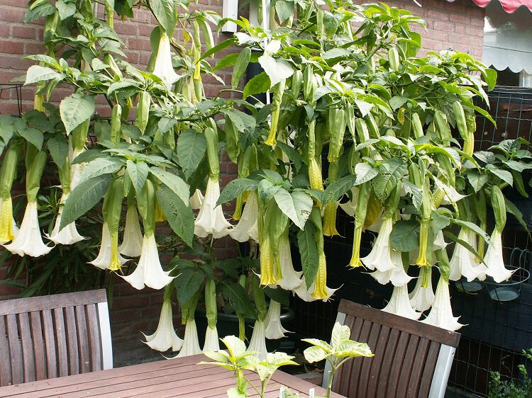 Om niet alleen maar grijzige, wellicht wat saaie foto’s hier te laten zien als slot nog even een kuipplant van formaat zoals die er in de zomer uit kan zien, de Brugmansia: