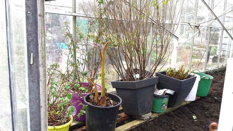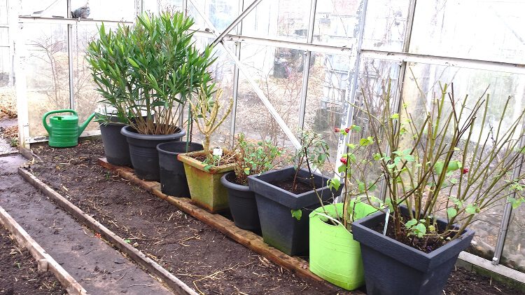 Op deze foto zie je planten in de koude kas. In een koude kas kan het in de nacht in de lucht net zo hard vriezen als buiten. Maar er zijn toch wat voordelen; in de zon kunnen potten en de grond/wortels daarin wel zo goed opwarmen dat het lang duurt voor in de nacht die pot met grond en wortels dan ook weer afkoelt en bevriest. Bovendien regent en sneeuwt en hagelt het in een kas niet, de planten kunnen er relatief droog en zonder al teveel stress overwinteren, mits ze dus wel wat vorst kunnen verdragen. Planten die daar in aanmerking voor komen zijn sommige Fuchsia’s, Oleander, Alocasia, Aloysia (citroenverbena), matig winterharde Salvia’s als microphylla, x jamensis, Amistadt, Abutilon, etc..