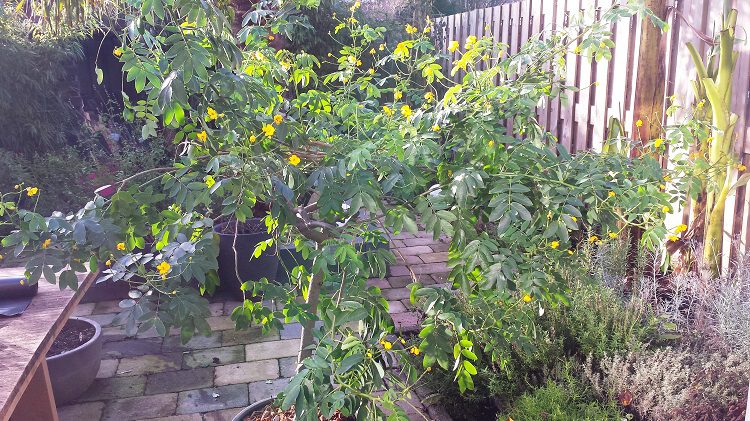 Als ik je trouwens ooit één succesvolle kuipplant aan kan raden, dan is het deze Cassia corymbosa (niet te verwarren met de Cassia didymobotrya die misschien wel mooier is maar minder lang bloeit en hier tot 2 keer toe de winter niet overleefde). De Cassia corymbosa op de foto heb ik al zeker 10 jaar, en elk jaar bloeit ze, van ongeveer mei (afhankelijk van het weer) tot in december (ook weer afhankelijk van het weer). Lang dus, heel erg lang. En rijk, zeer rijk. Even voor de duidelijkheid even een oude foto opgezocht: