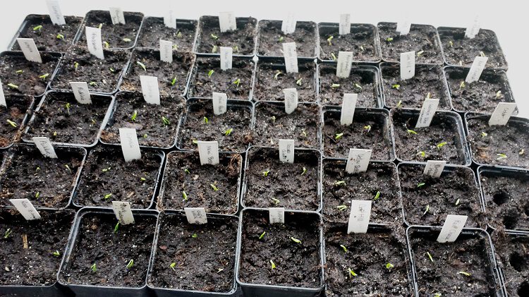En zo staan de eerste 40 potjes met zaailingen lekker warm achter glas in de zon. Er zullen er nog veel bij komen want dit is pas de helft vanalle pepers en paprika’s die ik heb gezaaid. De andere zaden zitten nog in koffiefilters in plasticjes, sommige zaden net gekiemd maar nog niet groot genoeg om te verspenen, soms ook nog helemaal niet gekiemd. Paprika-, peper- en auberginezaden kunnen wel ergens tussen de 7 en ruim 25 dagen over de kieming doen, afhankelijk van het juiste moment, de juiste omstandigheden, de soort, het ras, en natuurlijk de leeftijd van de zaden.