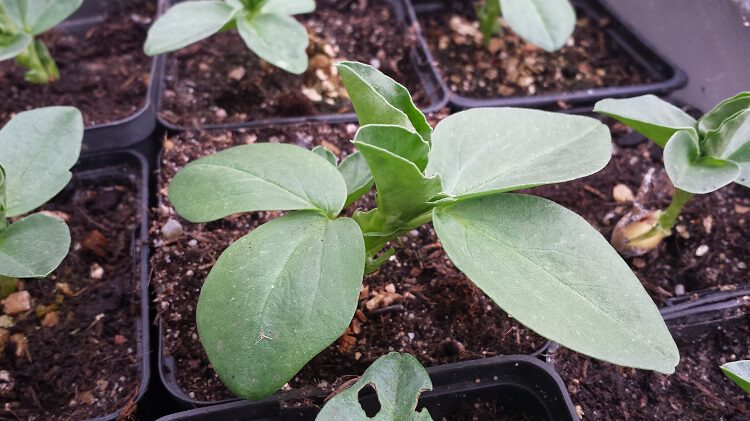 Op deze foto zie je de tuinbonen die ik eind januari onder koud glas voorzaaide; ook dat zijn mooie, gezonde, gedrongen plantjes. En ik zaai tuinbonen voor omdat ze hier nogal geliefd zijn bij vogels en muizen, maar je kunt tuinbonen in principe ook gewoon in februari in de volle grond zaaien; ze kunnen prima vorst verdragen. Bij strenge vorst kun je eventueel een vliesdoek op de zaaisels leggen. Maar binnenshuis zaaien is dus niet nodig, sterker nog; niet wenselijk want ook die zaailingen zullen lang en dun worden, op zoek naar het licht in een te warme omgeving.