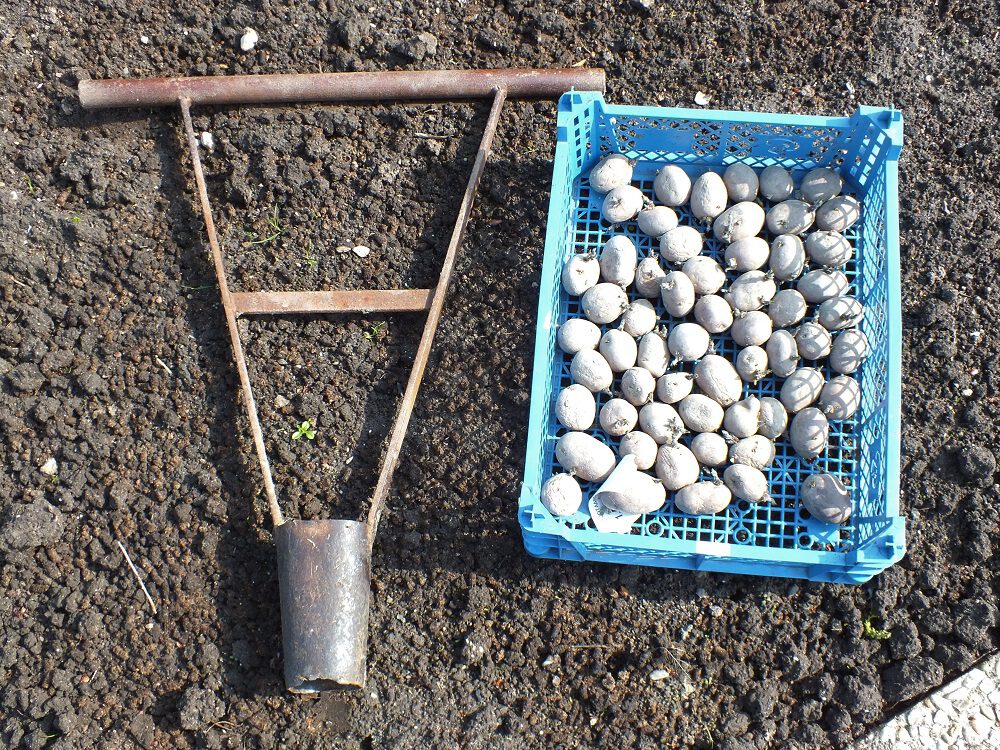 Voor het poten gebruiken we een echte aardappelpoter, ondertussen al ruim 30 jaar oud. Maar je kunt ook prima een bollenpoter gebruiken, of anders gewoon gaatjes graven met een schepje.