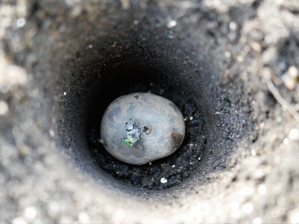 We maken eerst gaten in de grond en leggen vervolgens in elk gat (dat is wel zo’n 15 centimeter diep) een pootaardappel. En we leggen die zo dat de meeste/grootste uitloper(s) naar boven wijzen. Een uitloper wordt een stengel met blad, als je die ondersteboven in het pootgat zou leggen zou zo’n uitloper eerst onderlangs de pootaardappel heen moeten groeien om uiteindelijk boven de grond te kunnen komen. Met de meeste/grootste uitlopers naar boven gericht zorg je voor de kortste weg naar boven.