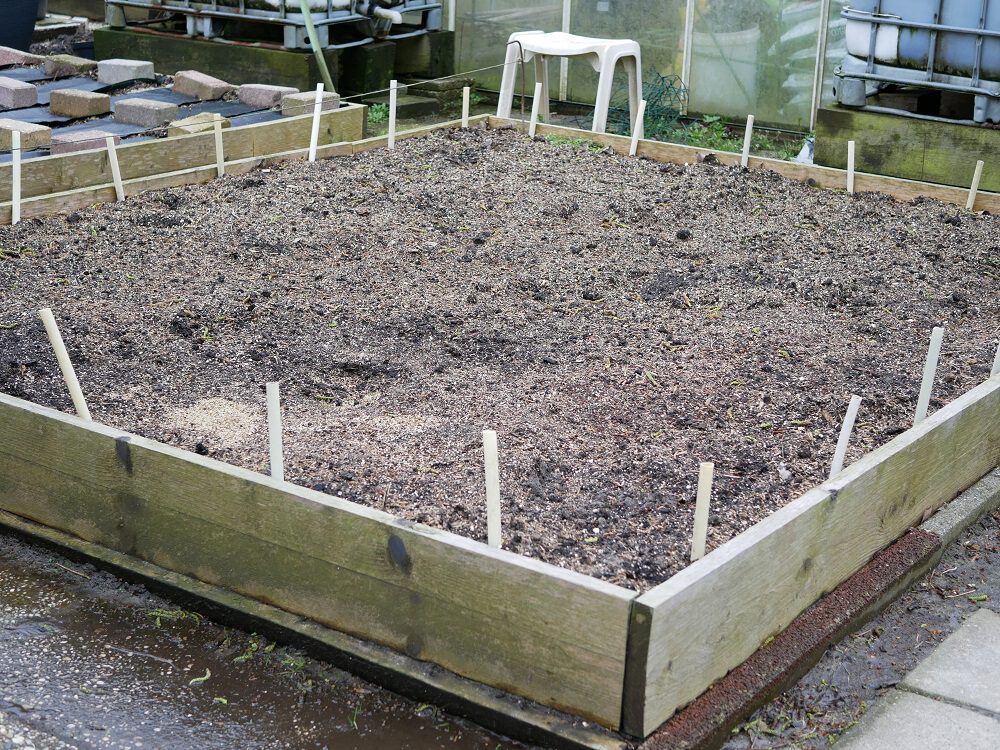 Wij maken eerst het vak in orde voor het poten. Dat betekent het onkruid eruit, en de grond omwoelen en aanharken. En voeden met organische moestuinvoeding. En alvast uitmeten waar de aardappelen komen. Hier staan ze in een verhoogde bak, maar in de volle grond gaat ook prima. De witte stokjes geven de plaatsen/rijen aan waar de aardappelen gepoot zullen worden.