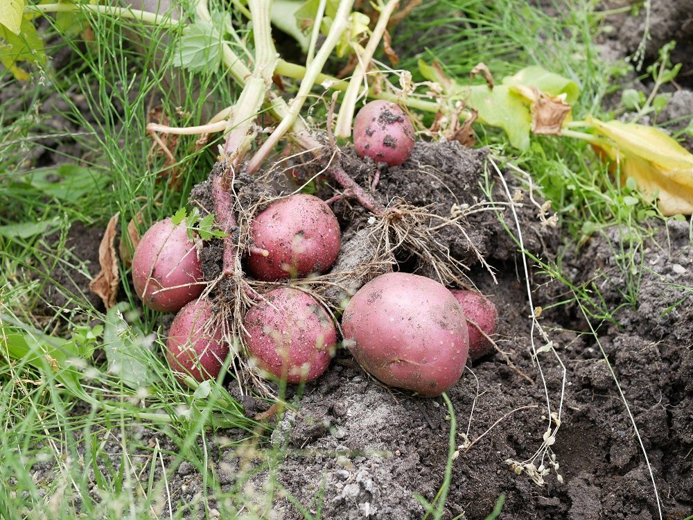 Ongeveer 90 tot 100 dagen na het poten van de aardappelen kunnen we eens proberen een aardappel te rooien. Om te kijken of we ze groot genoeg vinden om allemaal te rooien en op te slaan. En zijn ze nog te klein, dan hebben we in ieder geval wel een heerlijk maaltje aardappelen om te eten en bedenken we hoe lang we de rest van de aardappelen nog willen laten groeien. Elke pootaardappel kan (afhankelijk van ras en omstandigheden) zo’n 500 tot 1000 gram aardappelen opleveren. We weten dus nu al dat we ongeveer begin tot half juli de aardappelen kunnen rooien. Dat zet ik alvast in de agenda, want dan kan ik tijdig bedenken wat ik dan nog op die plaats kan telen en dat vlak voor het oogsten alvast zaaien.