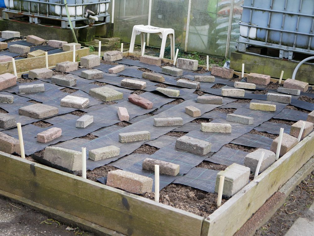 De stenen zijn nu nog nodig om de repen gronddoek op hun plaats te houden. Als de aardappelen eenmaal boven de grond komen blijven de buitenste stenen liggen maar kunnen alle andere stenen weg, want de planten houden het gronddoek dan op hun plaats. Je kunt dat enigszins zien op deze foto van een paar jaar geleden: