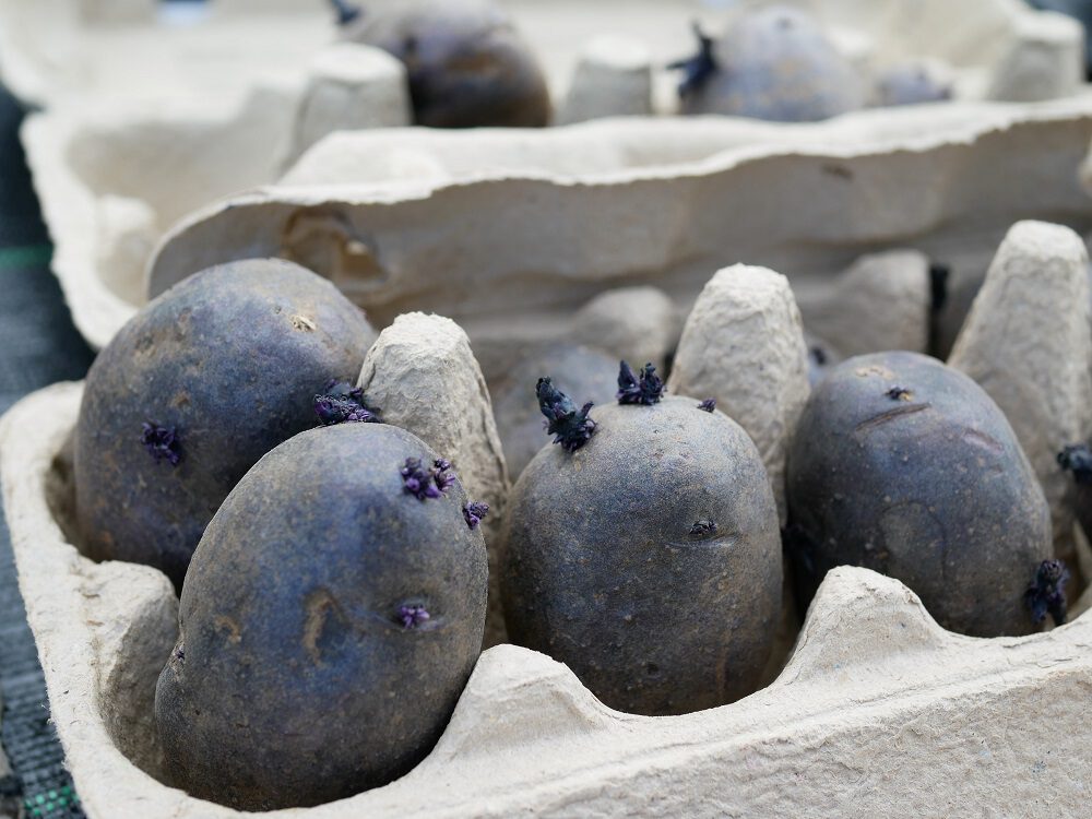 We poten deze vroege en middelvroege aardappelen op 40 x 40 centimeter. We hebben dit jaar gekozen voor de rassen Tiamo (een vroege en lekkere, vaste aardappel met goede opbrengst en smaak) en Bleue d’Artois (een wat meer kruimige aardappel met een mooie paarse kleur – ook van binnen).