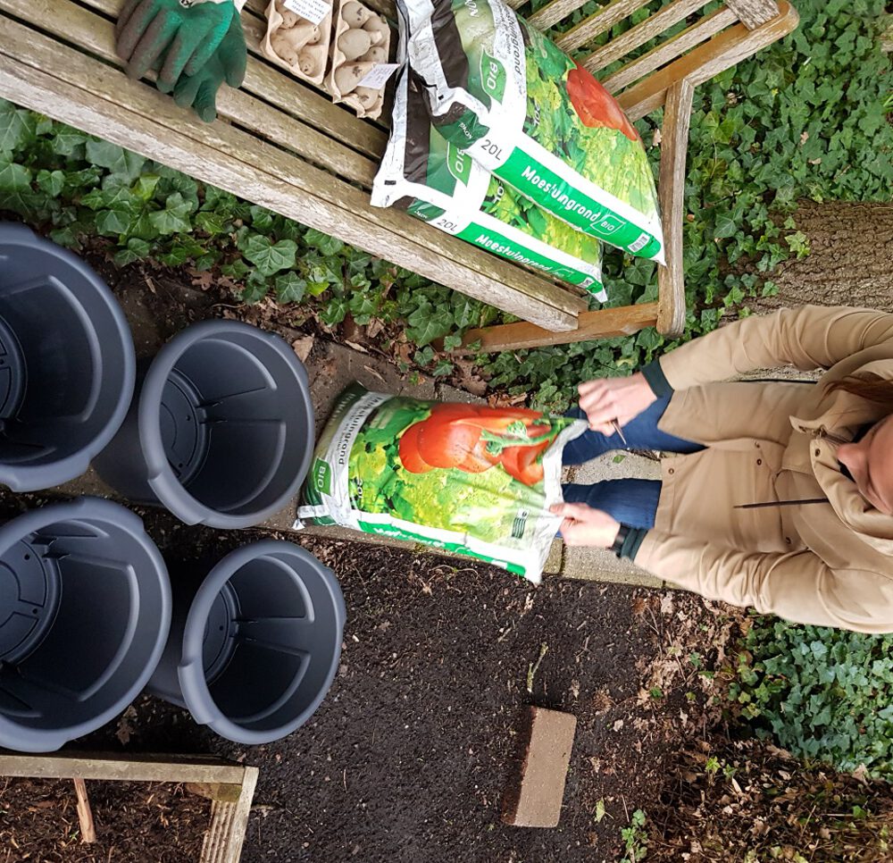 Neem de speciale aardappelpot en doe hier een laag van ca. 25 cm moestuingrond in. In een pot gaat een zak van 20 liter moestuingrond. Leg 3 aardappeltjes met de uitlopers naar boven in de pot. Zorg dat er voldoende afstand zit tussen de aardappeltjes. Dek de aardappels af met een laag van ca. 10 cm en druk het voorzichtig aan. Zorg ervoor dat er een stuk vrij blijft aan de bovenkant. Zo kun je later de aardappelen aanaarden. Als het eerste loof te zien is leg je nog een laagje moestuingrond in de pot over het groen en druk je het weer voorzichtig aan. Doe dit nogmaals als je nog ruimte in de pot hebt. Dit aanaarden zorgt ervoor dat de plant in de grond wat wordt gestimuleerd. Ook aan de rand van het oppervlak van de pot groeien knollen. Deze mogen niet boven de grond komen, want dan worden ze groen en dat is niet de bedoeling.