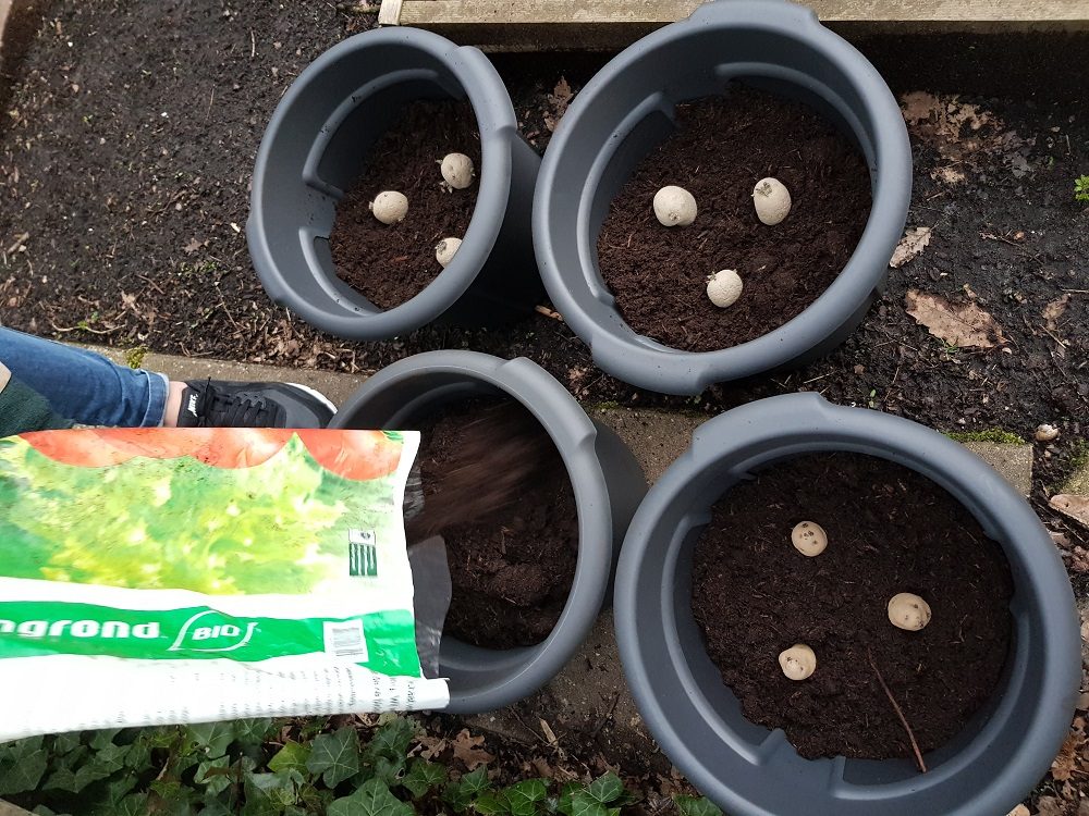 De aardappelen in potten hebben wel wat extra mest nodig, maar doe dit gewoon als je gaat aanaarden. Zorg dan dat je bemeste moestuingrond gebruikt. Hier zit weer genoeg voeding in voor de aardappels om groot te worden. Mocht je ze op een andere manier willen bemesten, zorg er dan voor dat er genoeg kalium in de grond zit en niet te veel stikstof. Stikstof zorgt namelijk voor veel blad en dat wil je minder hebben. Kalium zorgt voor een goede knol en daar doen we het voor.