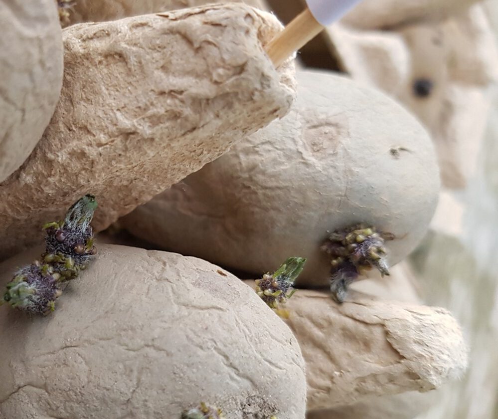 Het is zover: je kunt je voorgekiemde aardappelen in de grond planten. Dit wordt ook wel poten genoemd. Ik doe dit in potten en zoals je in de blog “aardappels kweken deel 1” hebt kunnen zien, heeft het heel veel voordelen. Je merkt dat de aardappeltjes die je op een koele maar lichte plek had staan nu helemaal rimpelig zijn geworden. Alle energie die in de knolletjes zat, zit nu in de wortels. De worteltjes zijn nu ongeveer 1 cm lang.