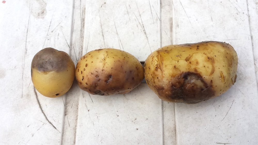 Op deze manier hebben we zelf wel eens een hele oogst verloren. Die oogst leek toen niet onaardig met slechts een klein percentage zieke aardappelen. Maar na de controle na 10 dagen verloren we nog eens 20% van de opbrengst. En 10 dagen daarna nog eens 25%. En weer 10 dagen later konden we nog eens 15% weggooien. En weer 10 dagen later nog eens 10%. Tot we uiteindelijk van 2 grote vakken aardappelen slechts 2 emmers oogst over hielden.
