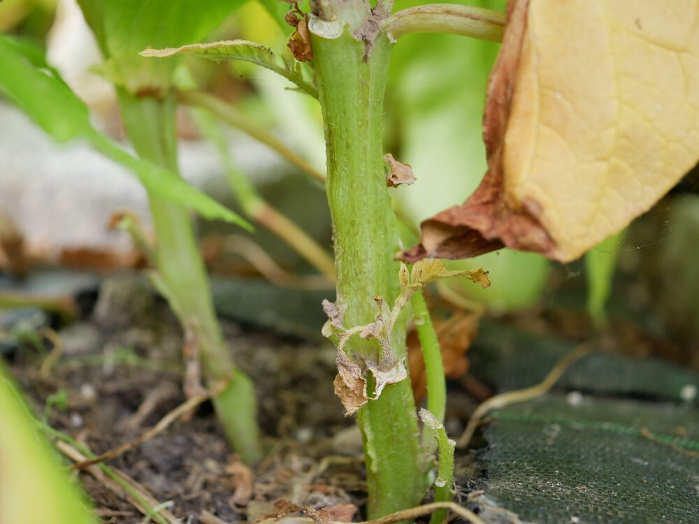 En nu bij onze aardappelen de eerste ziekteverschijnselen te zien zijn en we de aardappelen hebben geoogst zien we ook dat de stelen (de verbinding tussen loog en knol) nog ‘schoon’ zijn.