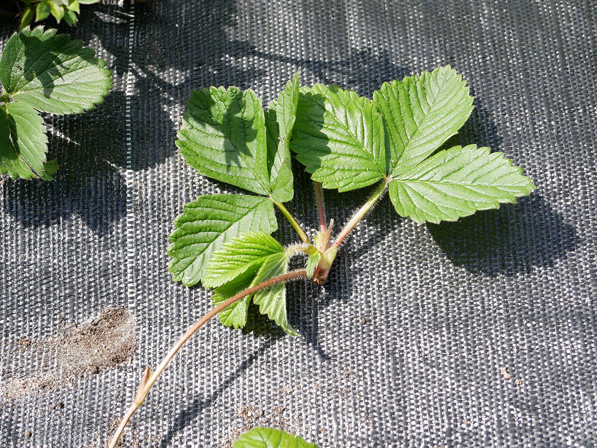 Op deze foto zie je aardbeistek-in-wording; ze heeft meerdere blaadjes en zelfs de eerste worteltjes worden al gemaakt.