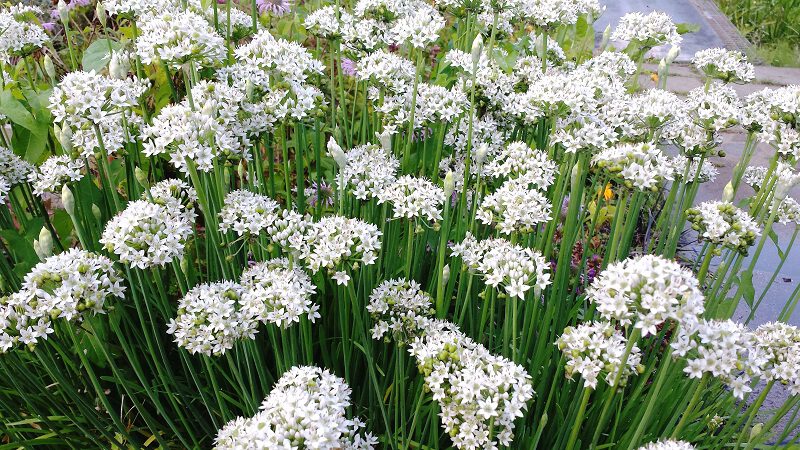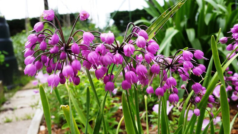 Allium cernuum, lage planten, eetbaar als bieslook. Maar ik vind de bloei in juni te mooi om er van te oogsten. Een eventueel eetbare sierui dus.