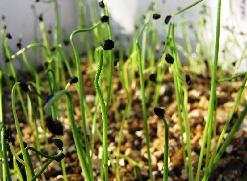 Op deze foto zie je kiemende preizaden (foto van vorig jaar), de zaden kiemen zo half tot eind februari, de zaailingen komen als ‘lusjes’ boven de grond.