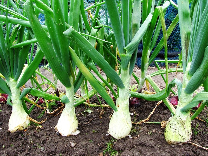 En tot slot nog een oude foto van ruim 10 jaar geleden. Dit soort uien zijn helaas niet lang te bewaren en hebben slechts een milde/zoete/zachte uiensmaak, en daarom zaai ik ze eigenlijk nooit meer. Maar als ik de foto’s zie krijg ik daar altijd weer spijt van. Want de uien van dit ras Ailsa Craig werden in onze tuin gemakkelijk zo’n 15 centimeter groot, op de foto zie je ter vergelijking erachter nog normaal formaat rode uien, de reuzenuien zijn daar nog volop in de groei (want pas bij het afrijpen worden de uien ronder en krijgen ze de karakteristieke bruingele schil).