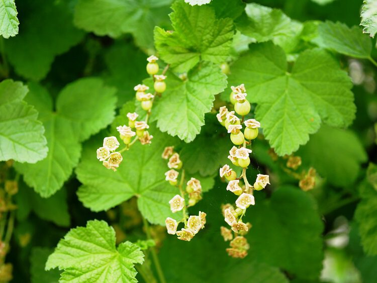 Op deze foto zie je de aalbes in bloei, en je kunt achter het kleine geelgroene bloempje zelfs al het vruchtbeginsel (het besje) zien.