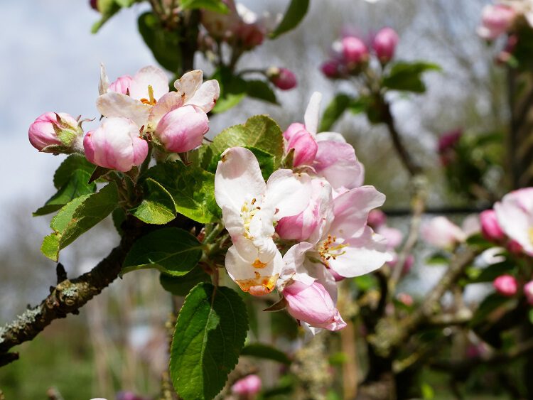 Op deze tweede foto zie je de bloesem van een appel; die bloesem is juist zachtroze van kleur en de bloemen verschijnen tegelijkertijd met het blad.