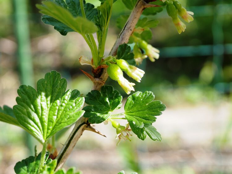 En datzelfde geldt ook voor deze foto van de bloempjes van een kruisbes; achter het kleine geelgroene bloempje zit al direct een minikruisbesje. Oei, pas wel op voor de scherpe stekels, bij het plukken van de rijpe kruisbessen (maar dan is het ondertussen al juni-juli) kun je er akelig je handen aan open halen.