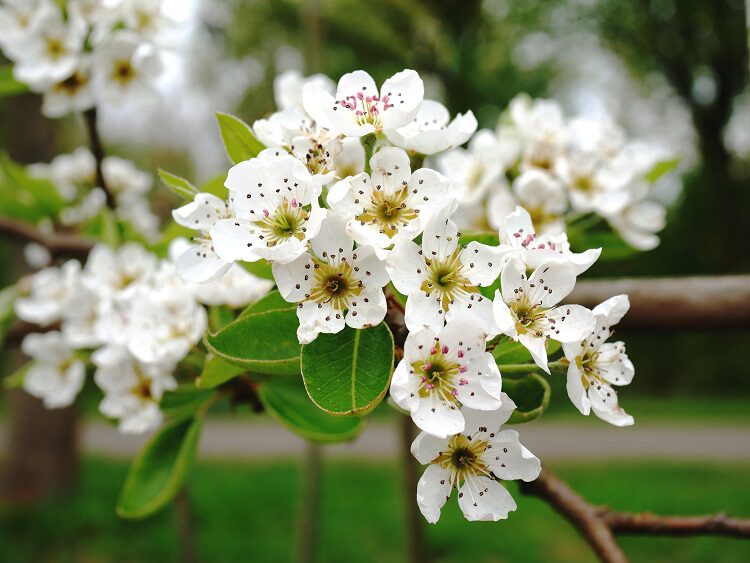 En op deze derde foto zie je de bloesem van een perenboom; die bloesem is dan weer zuiver wit en ook hier verschijnt ook het blad al.