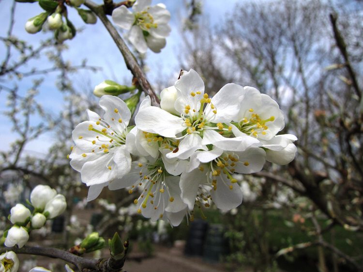Op de foto zie je de bloesem van een pruimenboom, altijd helder wit, en de bloei begint altijd op de kale takken (dus nog voor het eerste blad verschijnt).