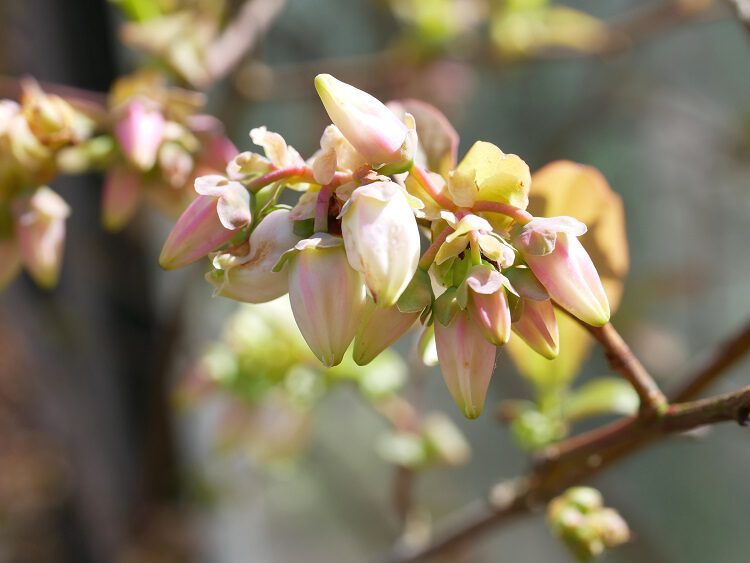 Op deze foto zie je de blauwe bes in knop; de bloei begint vaak laat in april en in mei, deze knopjes openen zich dan tot witte bijna belvormige bloempjes in trossen.