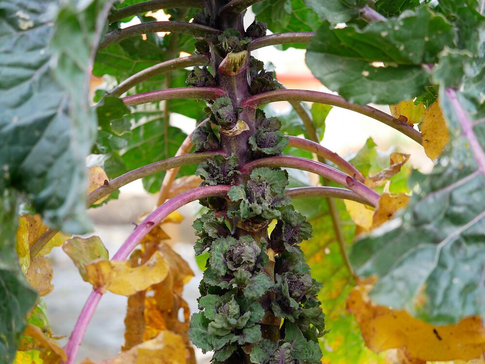 Zo worden de planten dus uiteindelijk groot/hoog en geven over een lange periode een prima oogst (hier was in 2019 de oogst wat hoger dan die van ‘gewone spruitjes’). Het nadeel is dat de plant dus heel lang een plaats in je tuin in beslag neemt (niet veel langer dan spruitjes of boerenkool). En zoals gezegd zijn de planten door de kleurencombinatie van grijsgroen met paars erg mooi.