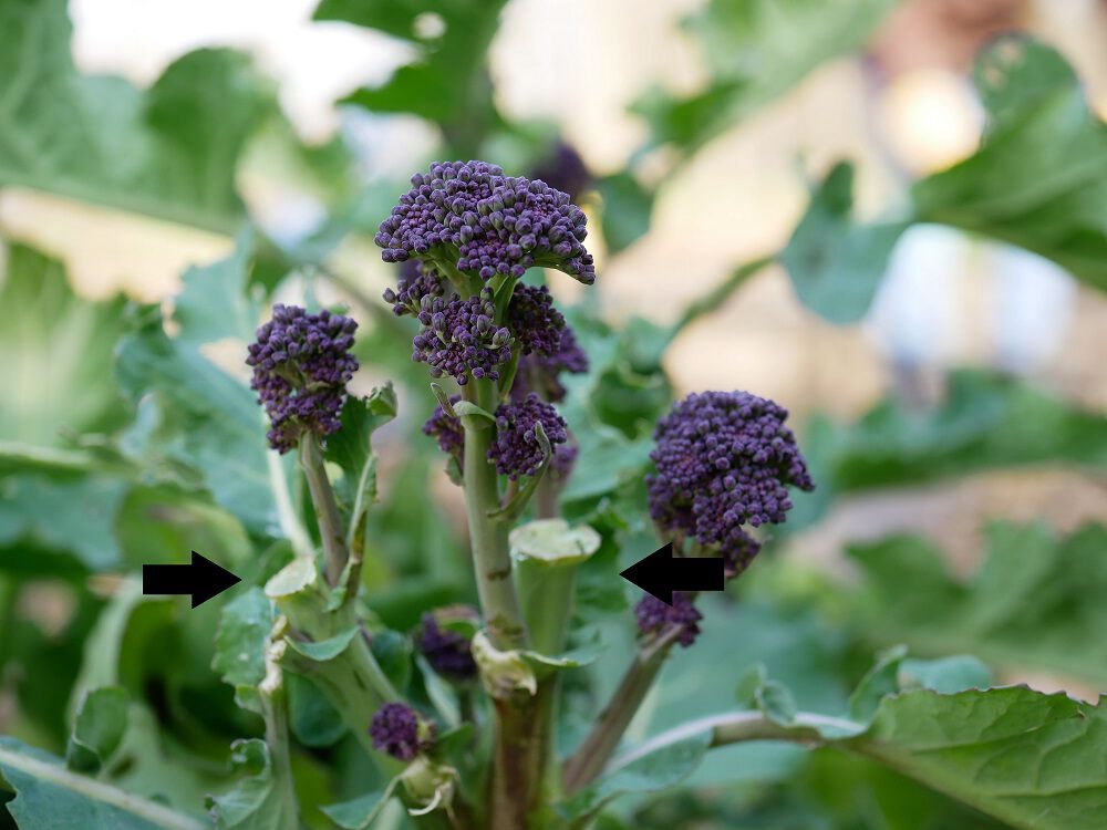 Op de volgende foto zie je bij de pijtjes de broccoliroosjes die ik 2 weken eerder oogstte (op de foto hierboven). Je kunt zien dat na de oogst de kleine broccoliroosjes ondertussen al weer zijn gegroeid.