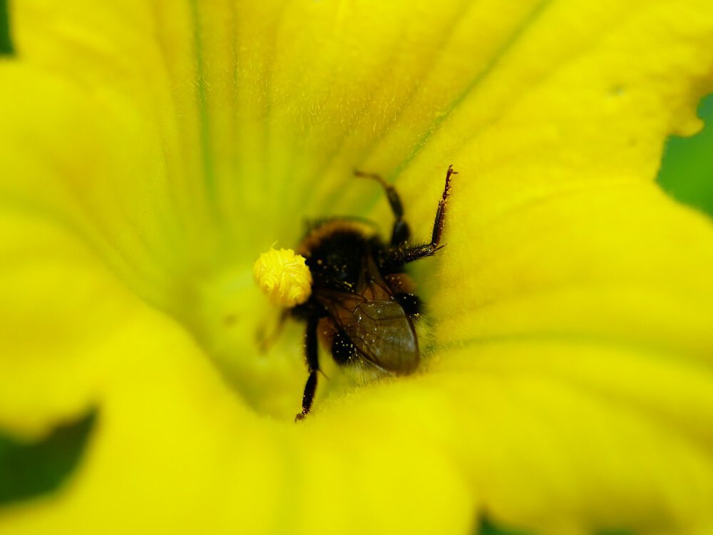 Op deze foto zie je een hommel in een mannelijke courgettebloem; haar hele lijf en pootjes zitten onder het stuifmeel. En nu maar hopen dat ze na het bezoek aan deze mannelijke bloem ook een vrouwelijke bloem wil bezoeken.