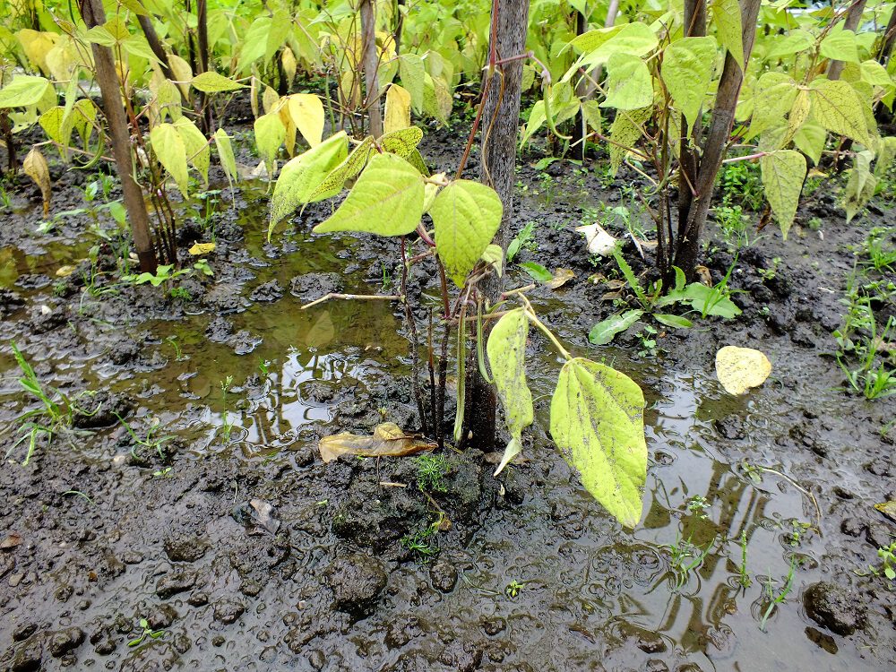 Dit is een foto van de stokbonen in 2012. Die zomer was toen zo lang zo klets- en kletsnat (net zo lang en hevig als nu de droogte is), dat alle groenten hier wekenlang in modder stonden. Rottende bonen, schimmel in courgettes, uien die letterlijk samen met eenden in een plas dobberden. Een complete misoogst. En we konden niets doen, behalve hopen op minder regen, en telkens weer nieuwe geulen graven waardoor het regenwater een klein beetje naar de sloot kon stromen.