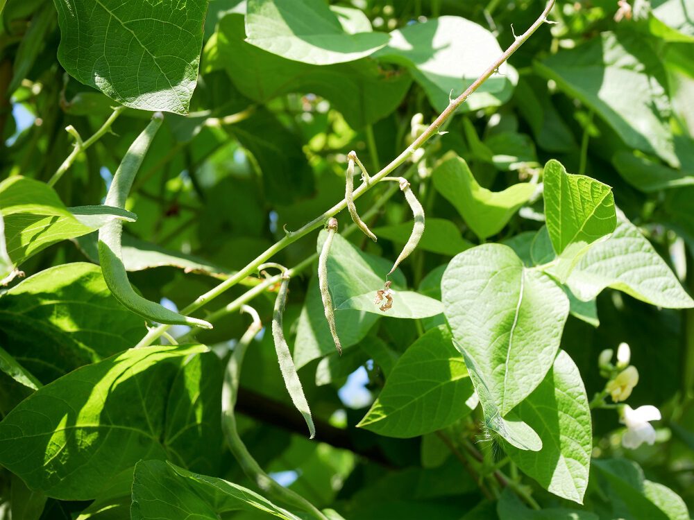 En de bonen doen het ook goed. Het is bekend dat die van zon houden, en van niet te natte grond. Bedenk dat ze wel wat water nodig hebben want bonen die aan planten groeien die te lang te droog staan worden stug en krijgen een draad. Pronkbonen kunnen juist beter tegen koele weersomstandigheden. Bij temperaturen ruim boven de 25 graden worden de bloempjes slecht bevrucht. Op de foto zie je zo’n trosje waarvan niet alle bloempjes ook daadwerkelijk peulen zijn geworden.