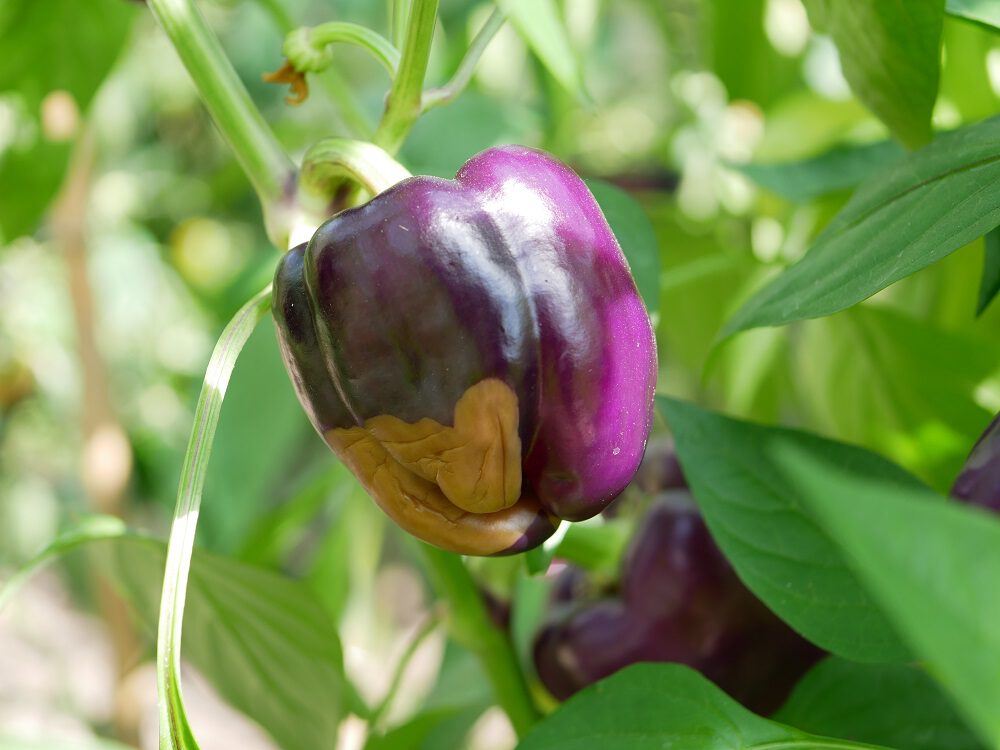Oh ja, niet alleen mensen kunnen hun huid verbranden; een aantal vruchtgroenten kunnen dat ook. Op de foto zie je links een tomaat met zonnebrand. Het lijkt niet eens zo erg maar de lichtgekleurde, bijna wittige plek blijft heel hard en oneetbaar; dat stuk moet er ruim uit weggesneden worden voor je de tomaat kunt eten.