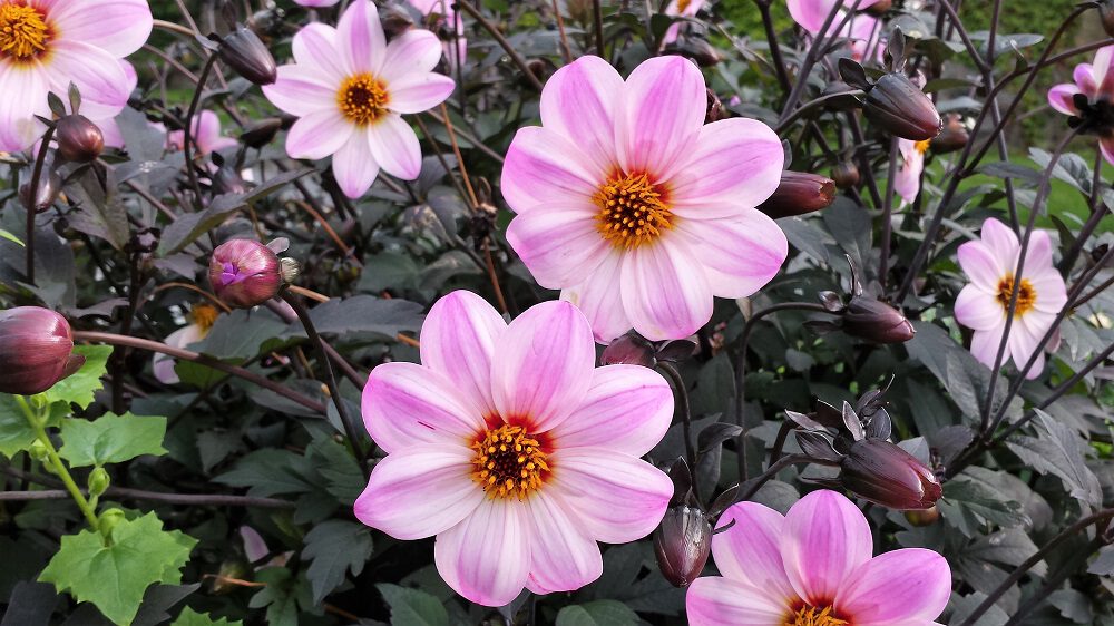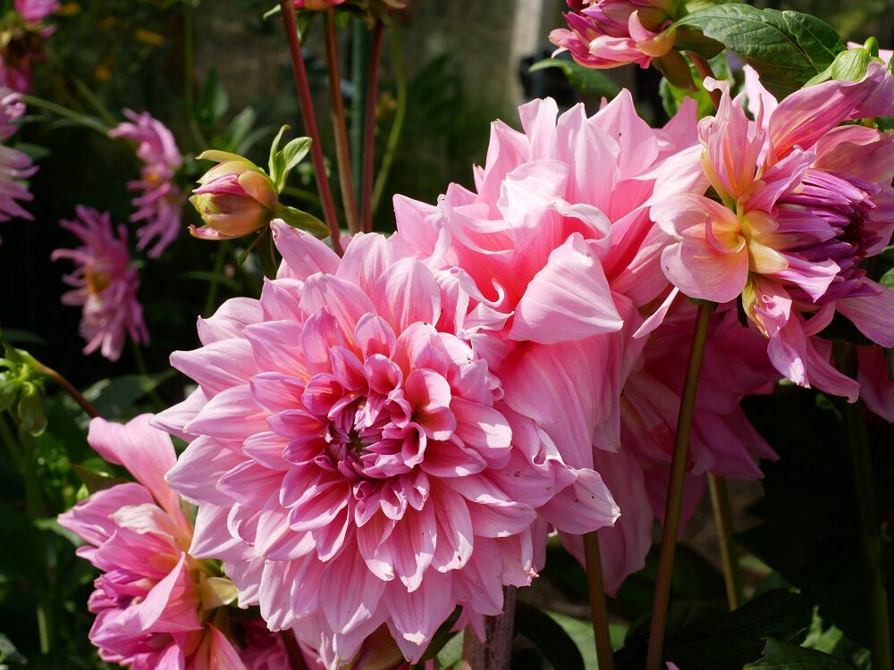 Op deze foto zie je ook een Dahlia. Met kleinere bloemen. En enkelvoudige bloemen. Maar wel lekker fel roze van kleur. En ook heel leuk: ze heeft donkerpaars blad. En dat is ook opvallend. Deze plant blijft wat lager en dat kan op bepaalde plaatsen in de tuin ook handig zijn. Ik zou deze Dahlia vroeger niet zo snel hebben gekozen maar nu zie ik hier zeker de voordelen van (en ik vind haar ook echt mooi).