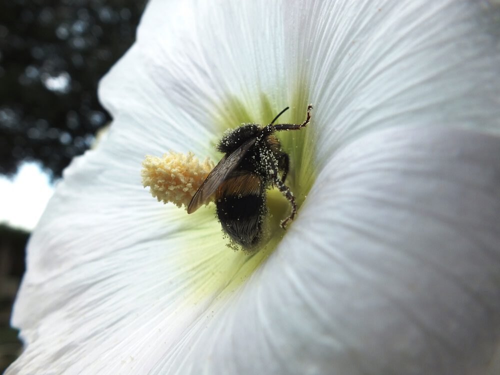 Je ziet dat de hommel niet eens hoefde te zoeken, er is in deze bloem een complete landingsbaan voor haar in de vorm van een gele vlek. En je ziet hoeveel stuifmeel de hommel al heeft verzameld. Van deze of andere stokrozen maar het kunnen ook pompoenen en courgettes zijn, of andere bloemen, groenten, fruit of kruiden. Hoe meer hommels in de tuin, des te groter is de kans dat er ook andere bloemen worden bezocht. Met dus potentieel een betere opbrengst. Trouwens, ik vind het ook gewoon leuker en vrolijker: gezoem in de tuin.