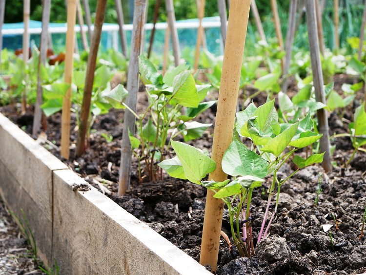 2 weken geleden (na ijsheiligen) gezaaid, en de jonge zaailingen net uitgeplant bij de stokken. Tegen de tijd dat deze planten zijn gegroeid en gaan bloeien is de oogst van groep 1 al voorbij en zijn zelfs de planten al gerooid en is hun plaats ingenomen door andere groenten zoals sla, andijvie, bietjes, knolvenkel, of wat er dan nog gezaaid kan worden (en dat is nog heel veel hoor!).