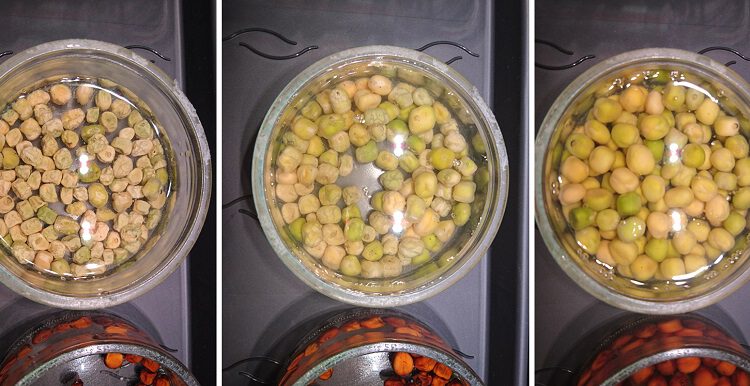 Een goede tip is om je erwtjes, maar dit geldt voor alle peulsoorten, voor te weken in water. Doe dit dan ook zeker 24 uur. Doordat de erwtjes zich helemaal vol hebben kunnen zuigen met water, ontkiemen ze sneller. Neem een glas of een schaaltje en doe hier 75% van het aantal erwtjes in dat je wilt gaan uitplanten. Doe er ruim water in, want de erwtjes zetten natuurlijk uit en ze moeten wel onder water blijven staan, anders kunnen ze gaan schimmelen. Op de onderste foto kun je zien wat er precies met de erwtjes gebeurt. Van links naar rechts: 0 uur in het water – 12 uur in het water – 24 uur in het water. Je ziet wel degelijk verschil. Je kunt natuurlijk voor jezelf een leuke test doen door een aantal zaden niet voor te weken. Zo kun je goed het verschil zien in aantal kiemdagen.
