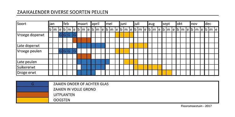 Waar ik al volop mee bezig ben, is het zaaien van erwtjes. Je hebt meerdere periodes om erwtjes en te zaaien in het jaar. Hieronder zie je ook een kalendertje van diverse soorten peulen.