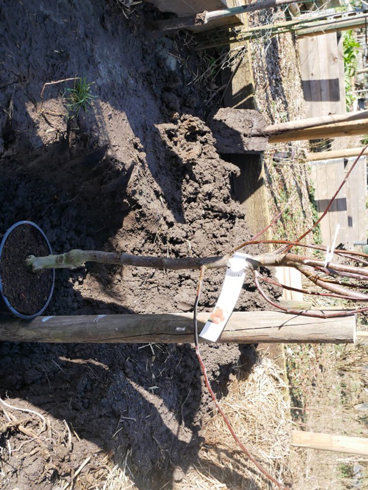 Nu wordt het tijd om te meten. Een fruitboom moet net zo diep worden uitgeplant als dat ze in de pot staat. Als je een boom met kale wortels koopt moet de entplaats heel ruim boven de grond blijven. Als je een boom te diep plant is de kans groot dat ze later vanuit het ondergrondse gedeelte uit gaat lopen. Op de foto kun je ook goed zien waar de ent zit; het verdikte stukje zo’n 15 tot 20 centimeter boven de pot.
