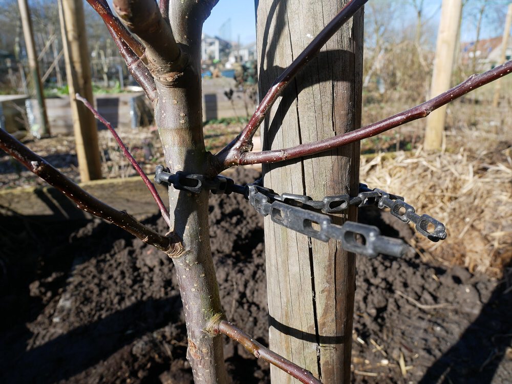 Gebruik voor het binden nooit ijzerdraad of andere materiaal dat kan insnijden. Het beste materiaal rekt wat mee, zoals rubber. En ‘maak een achtje’ zoals je op de foto ziet; door het rubber achter de boomstam naar je toe te trekken, te kruisen tussen boomstam en boompaal en dan naar voren te halen en dan vast te binden zorg je ervoor dat de 2 stevig aan elkaar zitten maar de boompaal de boomstam niet kan beschadigen of te strak kan zitten. Uiteindelijk controleer je de komende jaren een paar keer per jaar de bevestiging en maak je de knoop bij het dikker worden van de stam wat losser.