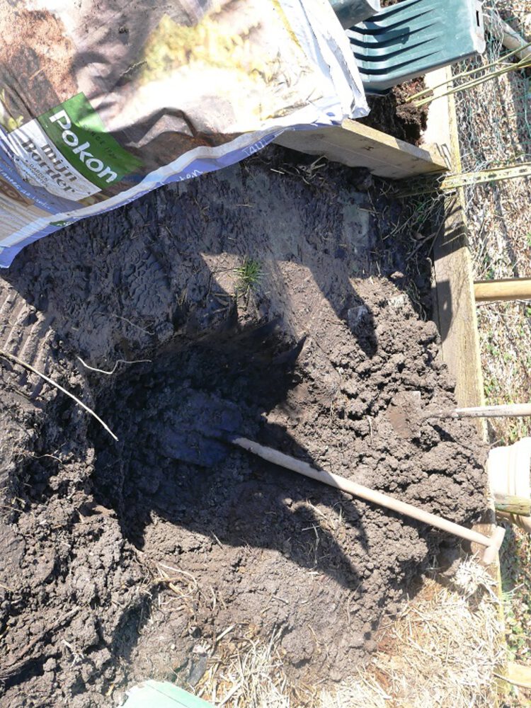 Afijn, op een zonovergoten dag in februari mocht dit appelboompje, van het ras Ecolette, de grond in. Eerst hebben we een flink plantgat gegraven.
