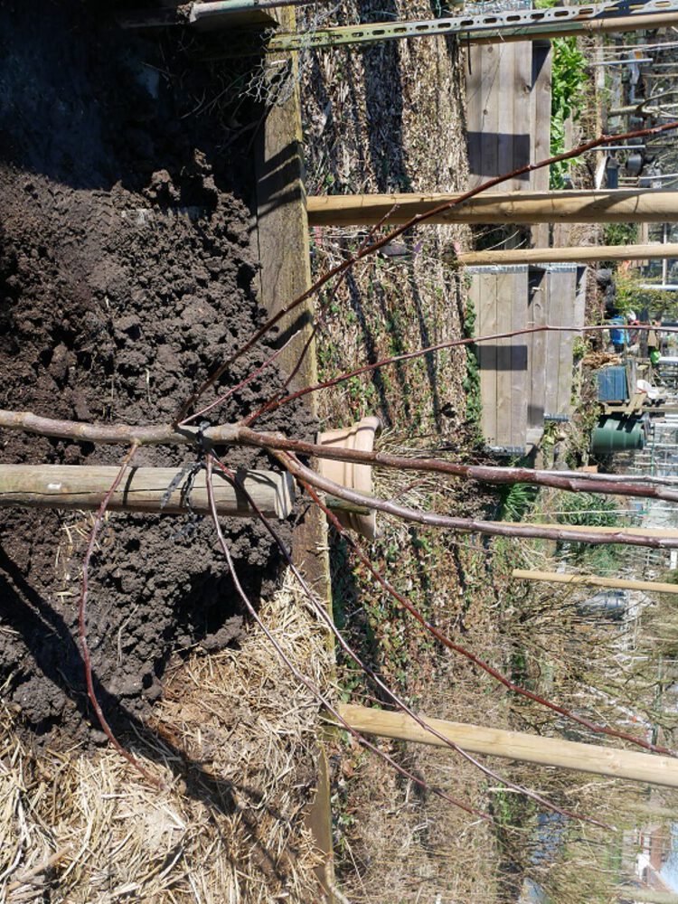 Tegelijkertijd slaan we nu ook een paal in de grond waar de boom wordt geplant. De paal wordt na het planten vastgebonden aan de boom zodat bij stevige wind de boom niet kan gaan ‘zwiepen’ (wanneer de boom eenmaal in blad staat kan ze veel wind vangen). Nieuwe, jonge worteltjes onder grond zouden dan gemakkelijk kunnen breken. De boompaal moet in principe zo rond de 40 tot 50 centimeter de grond in worden geslagen, en dan moet het bovengrondse gedeelte ongeveer net zo hoog zijn als de stam van de fruitboom.