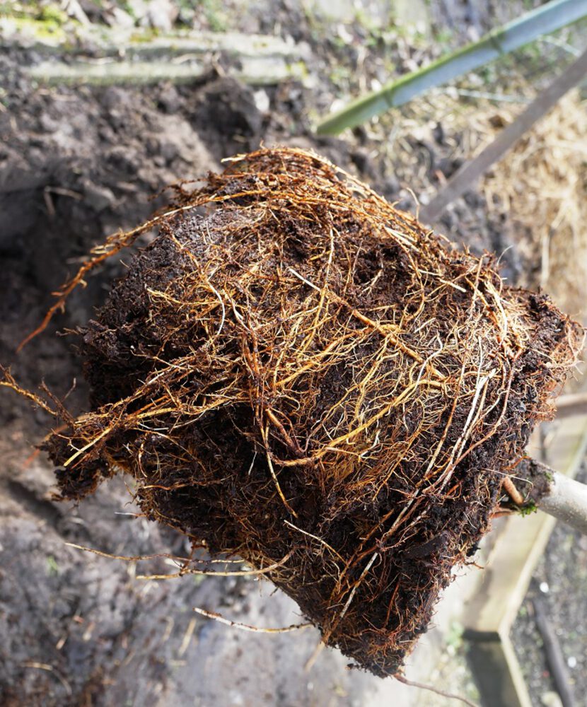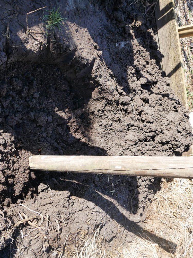 In onze vette klei is het belangrijk om een ruim plantgat te maken en dat te vullen met potgrond of aanplantgrond. We willen dat de overgang van goede en luchtige potgrond naar vette klei niet te plotseling en te groot is voor de wortels, om die reden mengen we in de onderlaag van het plantgat wat van de vette klei samen met de potgrond/aanplantgrond.